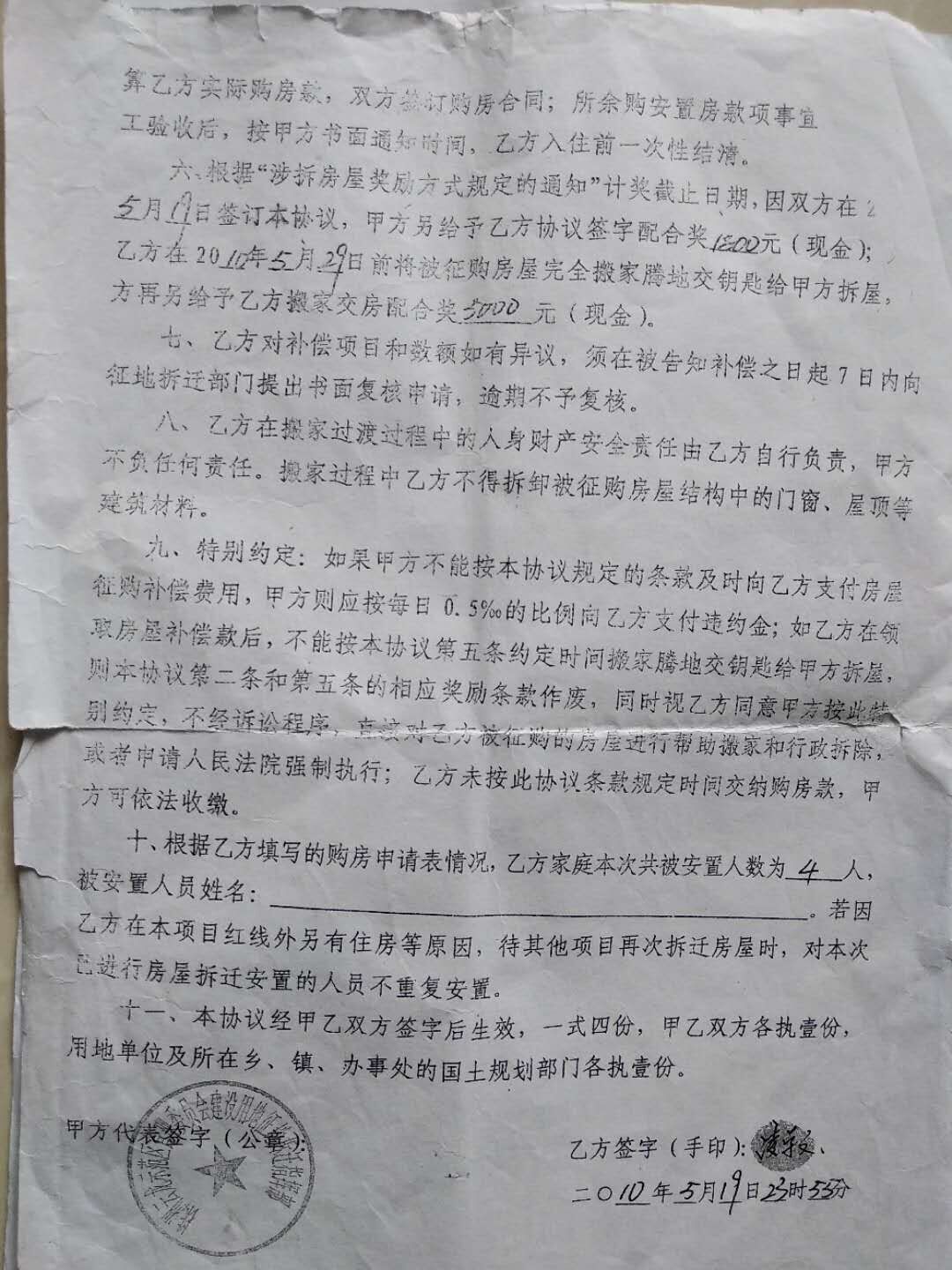 2010年15月19日,在诱导、怂恿、又处在不明真相的情况之下,于凌晨23时55分才签字画押。该镇政府依然按照(株政发[2006]20号)文件违规操作。此时,(湘政发〔2009〕43号)文件,以及(株政发〔2010〕11号之2)文件已出炉。五年的时间时差、物价差、房屋产权增值、花木花卉价格幅度增长等等,270㎡米(上下两层,200㎡米主房已装修,70㎡米杂屋未装修),仅只给了41万2494元(其中包括过度费、搬家费、装修费、以及附属设施费、主体结构补偿、提前腾地奖等),这一杯水车薪的坑人,实乃饮鸩止渴,竭泽而渔。此举演绎了时间倒流的谑话!元代无名氏《鱼篮记》一折:“……长江不见回头水,人老何曾再少年。”