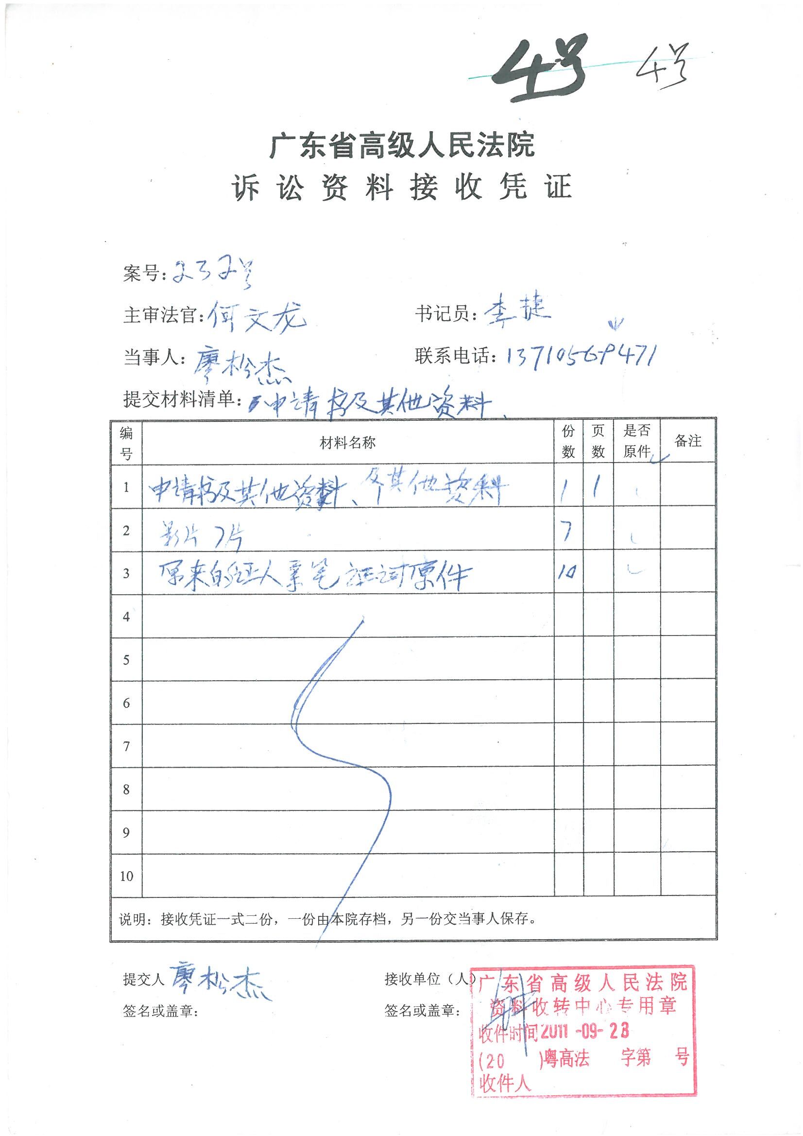 11、于2016年6月,另有法律界人士认为我廖松杰等人的案件确是个大冤案,也为我写了申诉书,于2016年6月27日只有和我等人一起再到广东省高级人民法院申诉,当天接访我等三人的是广东省高级人民法院信访室三号房的法官,我和法律人士拿出了一切证据资料让法官了解清楚我被公路征收案件的事实后,法官认为确是冤案,就对我们说,为什么当时在我们这里申诉不递交这些证据资料上呢,如今申诉期已过,我们是不受理的。最后我拿出以前在广东省高级人民法院申诉时递交过的人证物证资料回执与他论理,说明了以上我的一切证据都有送上过广东省高级人民法院的事实。但广东省高级人民法院三号信访室的法官只是说,就算是错了,我们出过裁定的也是有权不再受理的。最后把三号接访室的灯光也关息了,自己也走了。