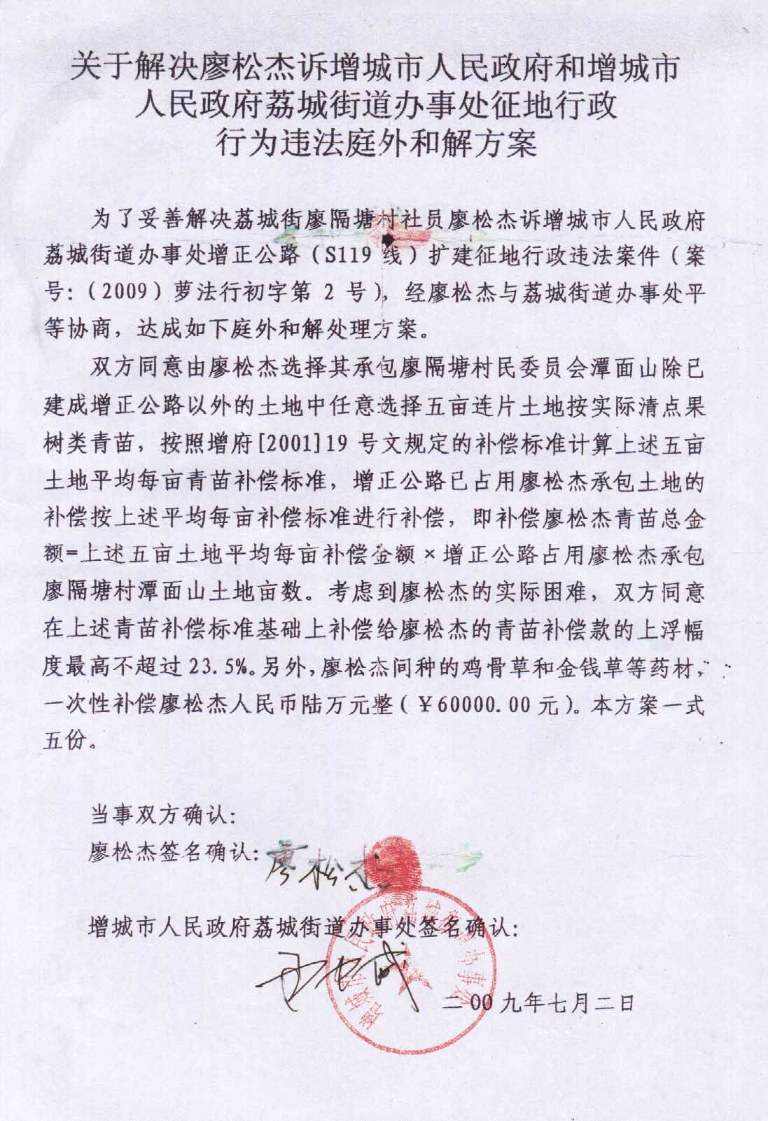 6、我的案件在一审时,增城政府曾骗我私自和解过一次,当时有荔城街的镇委正书记刘荣照和附城片的尹中威片长以及增城法院的廖伟超庭长与我面谈了一下,后来增城政府和增城法院共有两位庭长和镇委书记以及镇长、主任、片长等20名领导参加,当时他们骗我先签解决我被公路征收青苗的和解协议书,先解决好青苗,其他房屋家产附着物再当面核实解决的,所以我们在2009年7月2日签好了先解决青苗的和解协议书,共同选择了我被公路征收剩下果场当中的5亩地青苗,作为法律依据解决我被公路征收的青苗。我们增城政府和增城法院出动有近20名公务员和我廖松杰自己一起去丈量好共同选择作为解决我青苗的5亩地面积,清点好青苗。增城政府的领导尹中威等领导和增城法院的廖伟超庭长亲口对我说,如今任何一方也不能反悔了。但最后我们增城政府明知已骗我签了和解协议书只得青苗一样,房屋和家产附着物是没有签在和解协议书里面的,所以我们增城政府就一次又一次都以无法准确丈量面积为由,有意不与我和解了,最后我们增城政府只提出叫我一口价,给我150万元,但我认为按和解协议书还是按那户清点清楚青苗的同案人黄礼良的补偿标准就是青苗一样,我的补偿金也能达到150多万元,我98平方的宅基地房屋和家产附着物等等的财产就没有了,所以我才拒绝接受,后来法官就把我们共同叫到法院,法官问我们增城政府的领导和解时最多给我廖松杰多少钱,增城政府的领导就说我们如今给廖松杰的最多为130万元,但我认为更加少了,所以我与他们争执了一分钟,增城政府领导就说如今我们给廖松杰的最多不超100万元,最后争执了有3分钟,增城政府领导就说,如今我们给廖松杰的最多不超70万元,结果我的2号案件一审法院历时17个多月作出枉法裁判时,判了我们四户同案人的案件真的不超70万,只得65万多元。