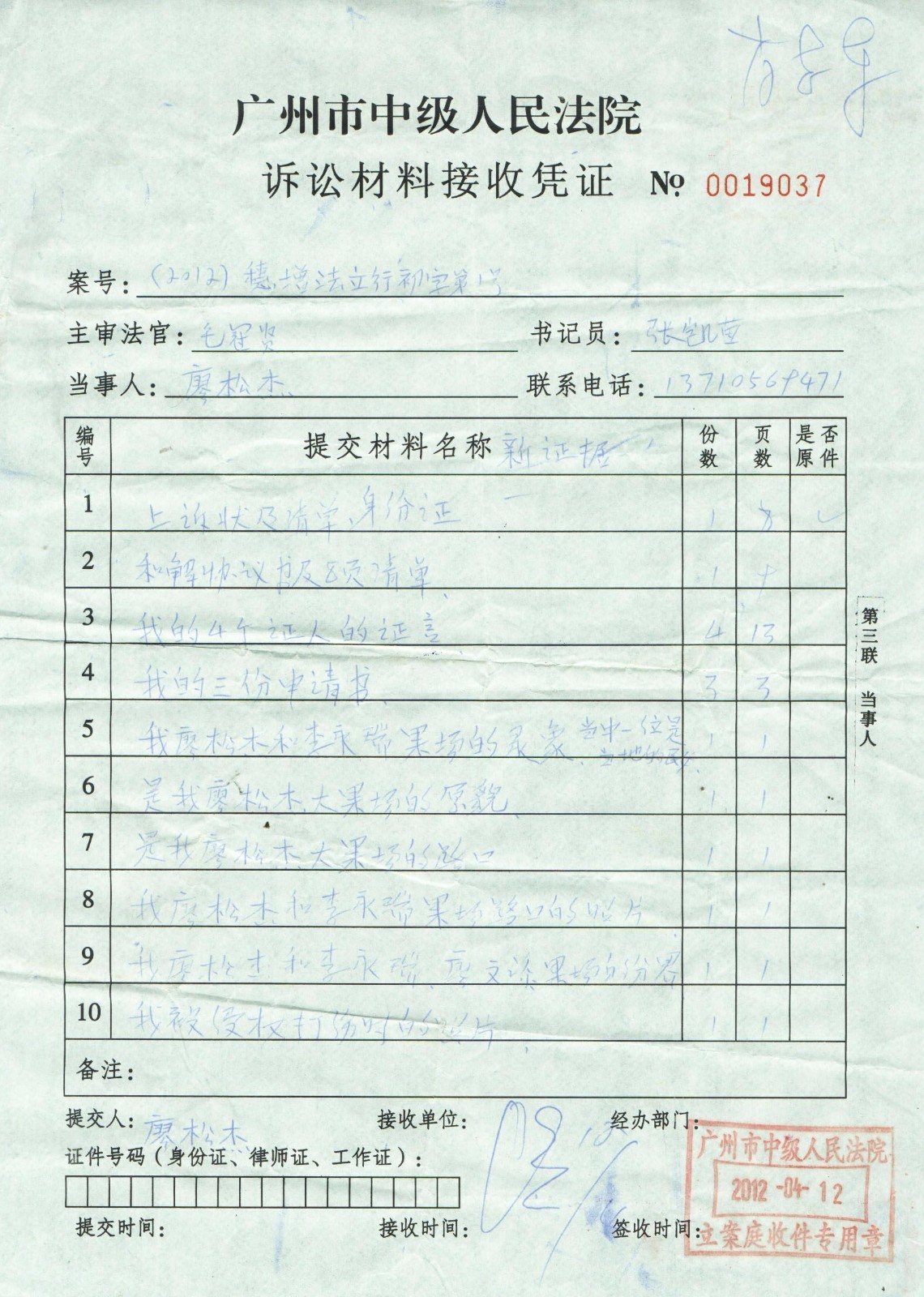 8、最后,我在上访时得到广州市中级人民法院行政庭肖志东庭长了解清楚我冤案的事实后,还一次又一次教我怎样申诉就可以了,可惜一次又一次都是不受理驳回和终结,最后我在上访途中又得到广州市中级人民法院领导田绘法官认真接访了我有近一个小时,了解清楚我冤案的一切事实后也认为确是个大冤案,就叫我写了一份书信,由他为我交给了广州市中级人民法院的刘年夫院长。最后还指导叫我只有到广州市人民检察院申诉,但最后得到的书面也是不受理。后来我和我的证人廖浩清找到了广州市人民检察院姓郑的经办检察官论理,他了解清楚我案件的一切事实后,他也认为确是冤案,叫我继续到一审法院申诉就可以了,但我找了法律人士为我写了申诉状,到了一审法院申诉时,只听一审法院的法官只是说我廖松杰的案件申诉期已过,他们是不受理的。最后我只有再到广州市中级人民法院上访,接访我的领导田绘法官还指导叫我只有重新走上访之路。希望能得到当大官的领导同情才可以解决了。而且我也亲自听过纪委的领导也亲口说过这样的话。于2013年5月16日,我只有再到增城人民政府上访,黄伟雄科长等三位领导就对我说,我们给你一份公函,带回荔城街道信访办交给郭永佳主任就可以了。我只有再次找到郭主任,把一切真实资料证据递交给了郭主任,最后得到的回复就是说我廖松杰是来电反映的情况,他们是不受理的。我只有再到增城人民政府上访,黄伟雄科长等几名领导就说,廖松杰你不要长期到来我们增城政府上访,我们绝对不会再接访你的,也不会再受理你案件的,你不要从中想来钻我们增城政府的牛角尖,最后我出示了新闻工作证,增城政府信访的领导黄伟雄科长等几名领导看了我的工作证后才接访了我,并教我填表,关于青苗请求按2009年7月2日我和增城政府双方达成的补偿标准执行,房屋、家产、附着物等的事情就请求落实庭外和解方案的内容,并叫我写明了我和我的证人廖浩清的身份证号码及两个人的手机号码,但最后又没有任何答复了。关于我的案件,在2008年至2010年,就是增城的市委书记大接访,朱泽君也亲自接访过我一次,还亲自叫当年荔城街的镇委书记刘荣照为我解决的,可惜最后也没有下文,徐志彪书记也亲自接访过我两次,也亲口叫了后任的荔城街镇委书记潘共恩为我解决的,当时在众多的群众面前,潘共恩也说过一定要合情合理和我解决,但最后也没有任何下文了,每次在众多的群众及记者面前他们都是装模作样的。