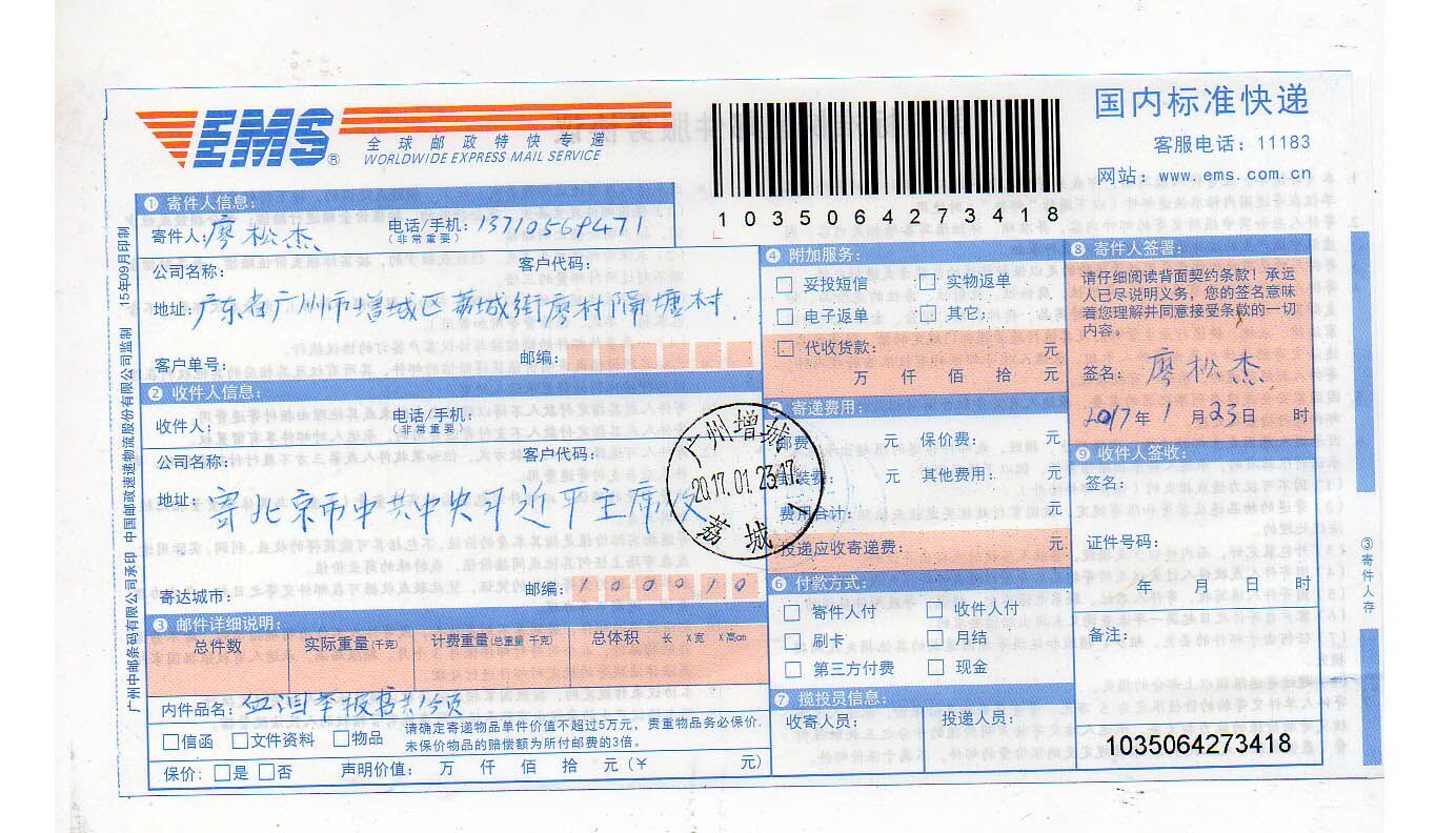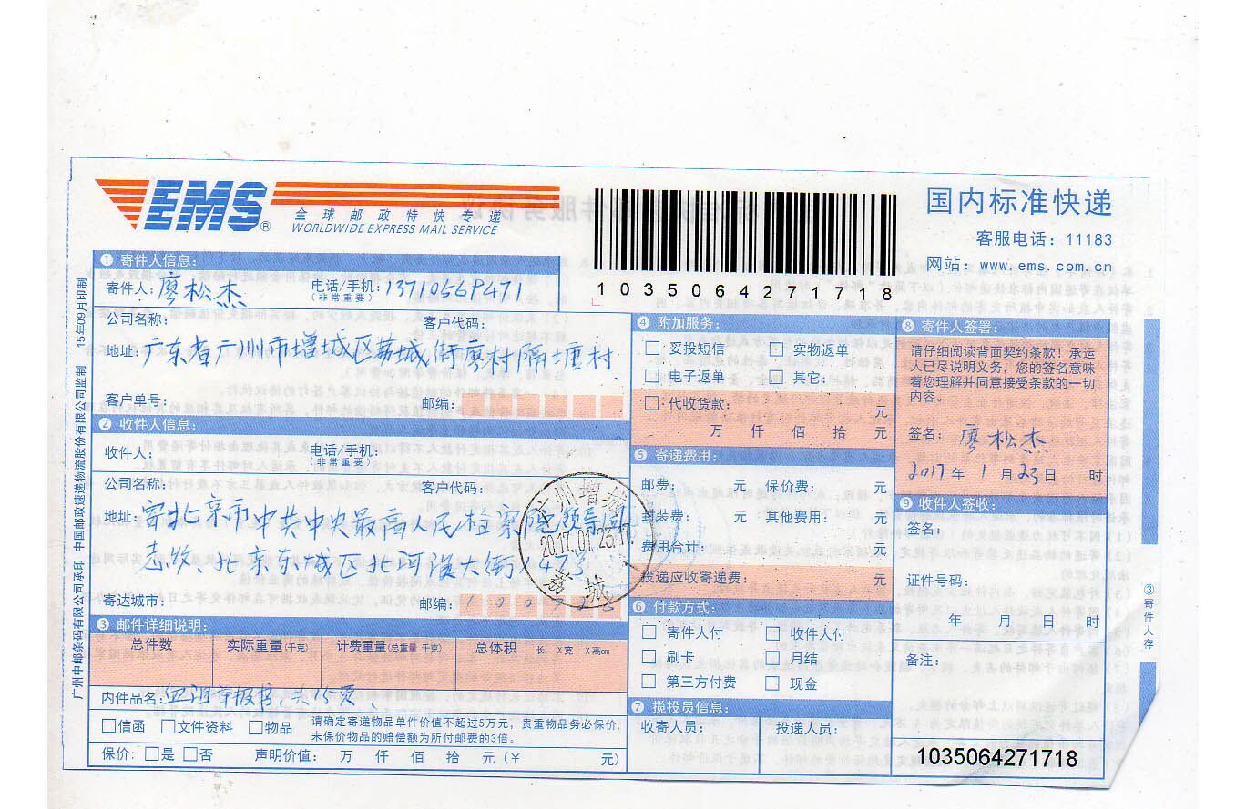 9、在我写书信寄给中央各部门时,我和我的一位证人名叫廖浩清在增城邮电局寄信时,只听领导说广东的部门可以寄,但中纪委和最高人民法院、最高人民检察院、中央人民政府以及国家信访局五个部门一律是不可以寄的,整个广州地区也是一样封住不准寄的。最后我出示了法治新闻报道网的工作证,增城邮电局的领导才先后为我寄出有10多份书信到中央各级部门,但不知他们能否收到我写的真实举报书呢?另外,为何我们广东省广州市的信不能寄上中央的各级政府部门呢?到底又有什么不可告人的秘密呢?还有更离奇的是我的案件在广东省高级人民检察院审查时,一审的广州市萝岗区人民法院,在2012年8月叫我们到去重审一次,2012年9月也叫我们到去重审一次,2012年10月16日又叫我们到去由正院长吴振主和副院长潘小登以及主审的金霞法官亲自接访了我和同案人一次,还叫我提出过诉求,并亲口表态,要依法合理解决我的案件,一共叫我签过三次笔录书,但最后广东省人民检察院把我的案件驳回和终结了。广州市萝岗区人民法院重审两次及院长接访一次,叫我签过三次笔录书的事情,连口头答复一句也没有。