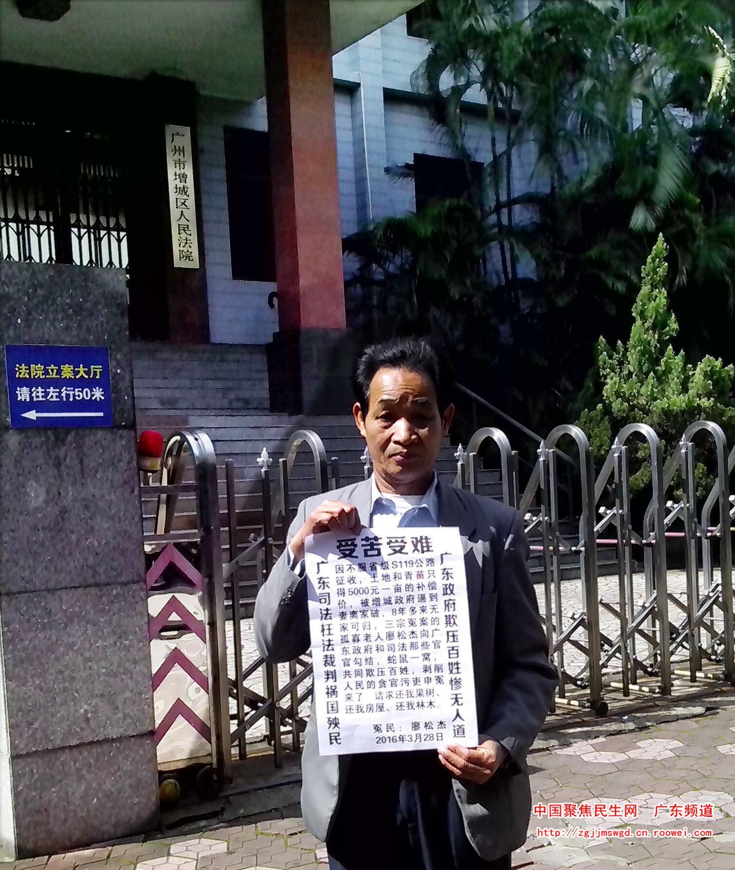 我是因2007年被广东省级S119公路征收,被增城政府逼到妻离家破,连连不断告官冤案的孤寡老人,名叫廖松杰,男,1956年9月25日出生,汉族,原身份证住址是广东省增城市荔城街廖村隔塘旧村10号,身份证号码:44012519560925245X,现租屋通信地址是:增城区荔城街湘江路164号,手机号码:13710569471,我们增城(原来是增城市,于2015年划为增城区的),我在1986年为了响应党和政府的号召,同一天承包了本村的两座荒山共为350亩造林种果,历经20多年的艰苦创业,无辜换来了血本无归和妻离家破以及得到了几宗都是中国有史以来被地方官欺压和剥削而造成最冤惨的告官冤案。我在上访上告途中,历经一次又一次被不明人士的明打暗伤,受尽那些办事人员的种种威逼、恐吓和侮辱,真的不知流尽了多少血和泪,9年多来,无家可归,物业荒废,四处流浪,苦度晚年。真的是民不聊生啊!
