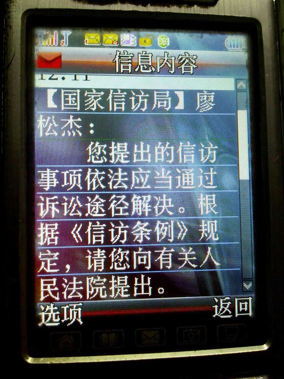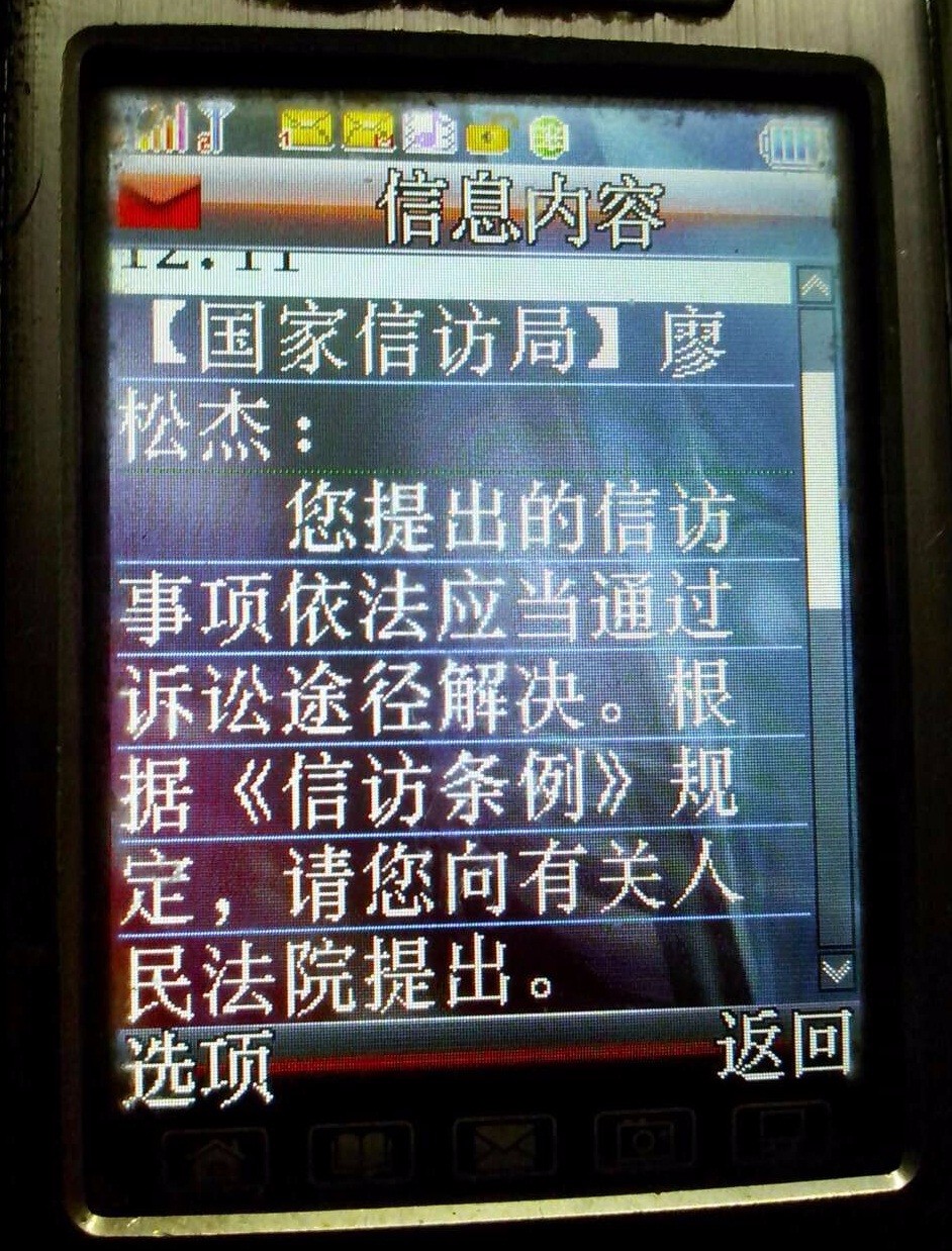 后来我叫人把我三宗冤案的事实资料送上北京后,只得到了一份增城国土局又是不受理的复函和收到过国家信访局的一条手机信息,就是指我走法律途径,以及得到了增城区荔城街党的群众路线教育实践办公室301号房黄海峰领导叫我等人到去递交了三宗冤案的证据资料,了解清楚我的事实后,还亲口表态,叫我廖松杰放心,如今已有人跟踪我廖松杰案件的,在一到两个星期内就会有人找我廖松杰解决三宗冤案的,但最后也没有下文了。另外,在2015年6月,我花有2000多元还到过广东省深圳市罗湖区红岭中路中央的第一巡回法庭,想递交材料申诉,但第一道关的三位法官审查过我案件资料后,也认为可以受理;第二道关两位法官也审查过我案件的资料,也认为可以受理;并把我的两宗大冤案的资料输入电脑里,第三道关是巡回法庭的第三号房接访室的法官,看了我的案件三分钟后就给我们增城政府打了一个电话谈了两分钟,最后就只是对我说,他们是绝对不会受理我廖松杰案件的,就把我赶走了。到底在电话上我们增城政府又跟巡回法庭三号接访室的法官说过什么话呢?