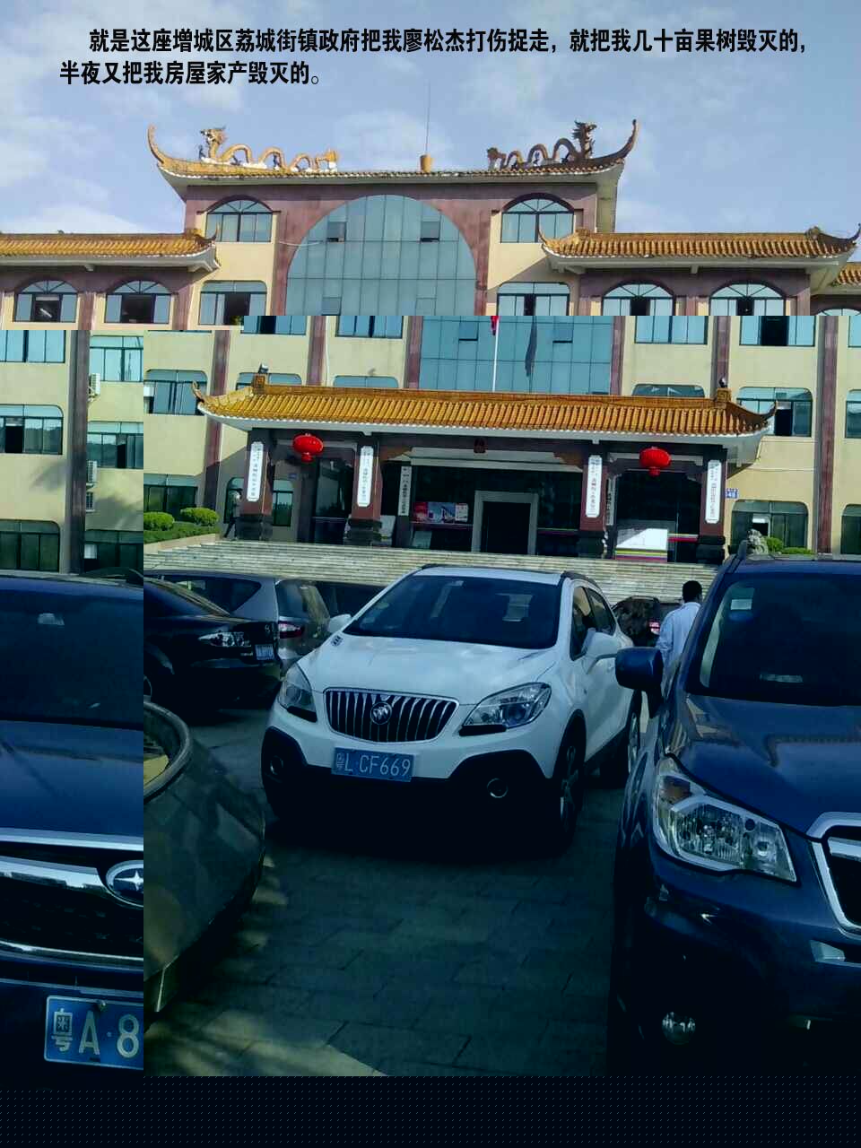 2、事情是这样,我于1986年承包了我村的一座名为潭面山的150亩荒山,我种植了近100亩荔枝果树,于2007年因省级S119公路扩建征收。在2007年8月24日,荔城街政府和我村政府的领导到我住处正式对我口头通知说:“今次省道征收土地和青苗每亩最高为5000元的补偿价,青苗最高每亩为2800元,房屋每平方为250元,附着物无补偿”,还压令我要在6天内要我把自己种有21年的荔枝果树和附着物全部自行清理完,如6天内不自行清理完就全部当无主处理。第二天,即2007年8月25日,我只有到增城市人民政府上访,当天,黄伟雄科长接访了我,随后我也到过广东省市等多个部门上访,但得到的就是在未与我核实好面积和未与我清点过任何一棵青苗的前提下,增城政府就真的动用铲车和勾机把我的果树当无主处理,强行毁灭了有一大片,最后经我与他们拼命相争才制止下来,我只有到广东省人民政府上访,领导就发给我一份书信,叫我带回交给了增城市人民政府信访局的姚国昌局长,但得到的是增城政府就压令我村委会在2007年10月30日下午5点半钟才到我住处发了一份通知给我,说由2007年11月1日起要提前收回我被公路征收的承包地,当时还有住在我这里的几户人家也亲自看到过的。第二天,即2007年10月31日早上,我只有再到增城市人民政府上访。但得到的就是,在当天下午,我们增城市人民政府荔城街道办事处和公路局、建设局、国土局,以及我村委近20名领导到我果园帮我清点了半天青苗,即我自己大果园里的只是其中一部分果树,负责清点青苗的领导王国峰就叫我在当天清点青苗的清单上签了一条名字和打了一个指模,怎知增城政府叫我签下名字去了,他们连夜电话联系,纠集了大队的公务员及警力有200人,在2007年11月1日早上按发了通知给我的日期就是我们增城政府早已定好的日期,我刚起床还未开门,我们增城政府就到我果园强行开工了,当时我果园的三个大公路口还有大量警力把守,我只有苦苦要求他们一定要帮我把三个果园全部青苗清点好,附着物也要清点好才开工,那时出现有几十名便衣警察在我身前身后把我围住, 但荔城镇的领导张华义镇长等领导就马上下令强行开工,当时我只有拼命与他们相争,最终被打伤再由16名警力把我捉走了,就把我和另外三户同案人合作的共为三个果园的35.4亩果树和山上一间放杂物的库房也毁灭了。最后在一天夜间又把我的98平方宅基地房屋和家产以及一切附着物也毁灭了。